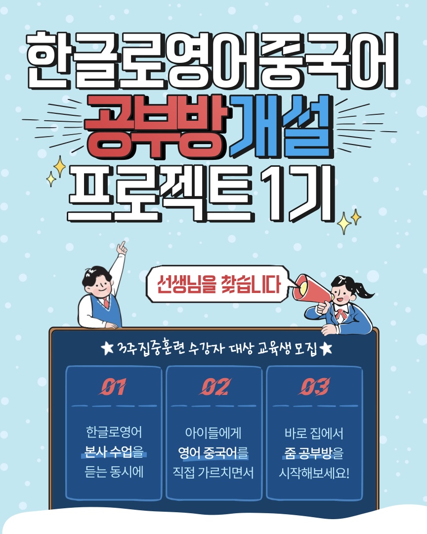 한글로영어 전문 선생님이 되어 아이들에게 영어와 중국어를 가르쳐 나가실 1기 교육생 분들을 모집합니다!