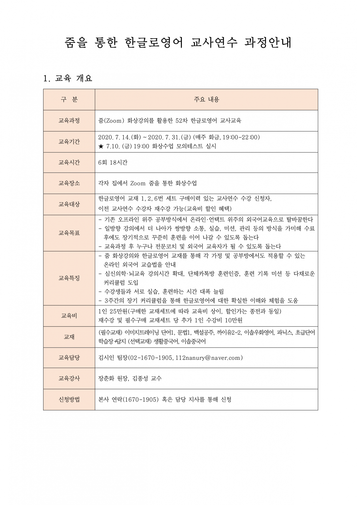 ○교육과정 : 줌(Zoom) 화상강의를 활용한 한글로영어 교사교육