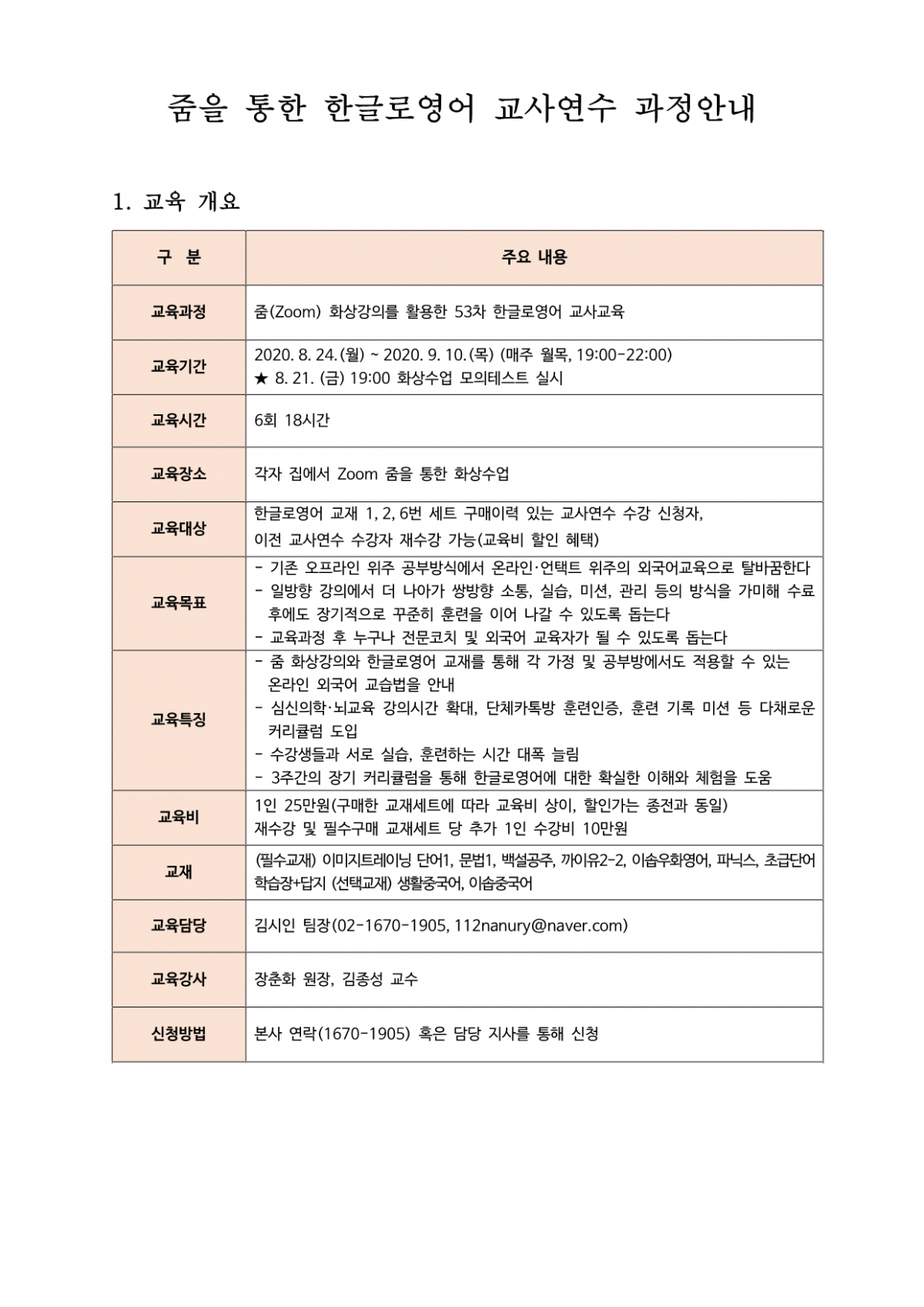 ○교육과정 : 줌(Zoom) 화상강의를 활용한 한글로영어 교사교육