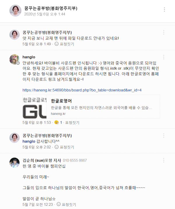 안녕하세요! 바이블비 사운드펜 인식됩니다 :-) 영어와 중국어 음원으로 되어있어요. 현재 갖고있는 사운드펜 안의 음원파일 형식(.iistk or .stk)이 무엇인지 확인한 후 맞는 형식을 홈페이지에서 다운로드 하시면 됩니다. 아래 한글로영어 홈페이지 다운로드 링크 남겨드릴게요~!
