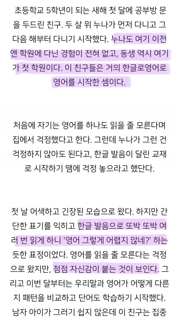 처음에 자기는 영어를 하나도 읽을 줄 모른다며 집에서 걱정했다고 한다. 그런데 누나가 그런 건 걱정하지 않아도 된다고, 한글 발음이 달린 교재로 시작하기 땜에 걱정 놓으라고 했단다.