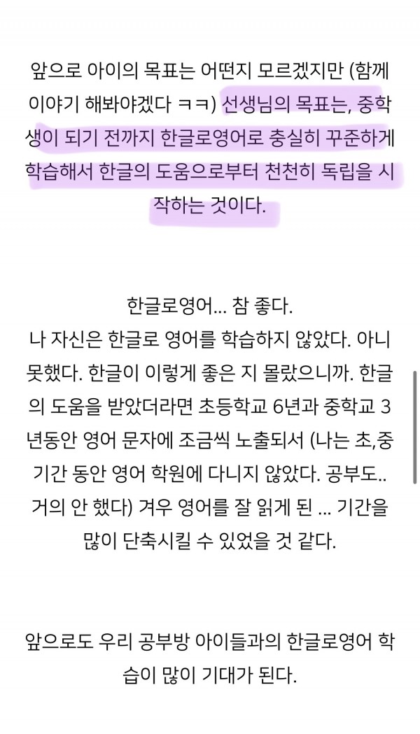앞으로 아이의 목표는 어떤지 모르겠지만 (함께 이야기 해봐야겠다 ㅋㅋ) 선생님의 목표는, 중학생이 되기 전까지 한글로영어로 충실히 꾸준하게 학습해서 한글의 도움으로부터 천천히 독립을 시작하는 것이다.