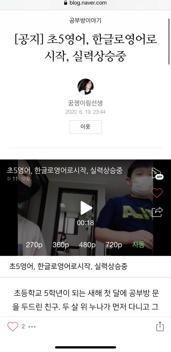 초등학교 5학년이 되는 새해 첫 달에 공부방 문을 두드린 친구. 두 살 위 누나가 먼저 다니고 그 다음 해부터 다니기 시작했다. 누나도 여기 이전엔 학원에 다닌 경험이 전혀 없고, 동생 역시 여기가 첫 학원이다. 이 친구들은 거의 한글로영어로 영어를 시작한 셈이다.