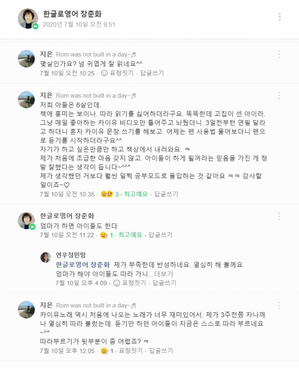 책에 흥미는 보이나. 따라 읽기를 싫어하더라구요. 똑똑한데 고집이 센 아이라. 그냥 매일 좋아하는 카이유 비디오만 틀어주고 놔뒀더니. 3일전부턴 연필 달라고 하더니 혼자 카이유 문장 쓰기를 해보고. 어제는 펜 사용법 물어보더니 펜으로 듣기를 시작하더라구요^^