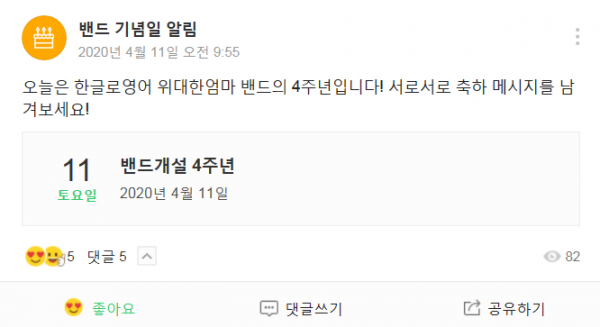 오늘은 한글로영어 위대한엄마 밴드의 4주년입니다!