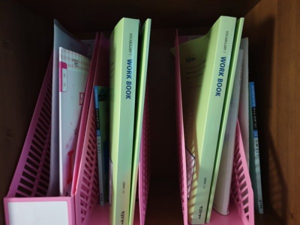 처음에 진도표를 만들어 쓰기 시작했을 땐 사무실에서 보통 쓰는 노~란색 폴더를 사용했었다. 맨 윗 부분에 구멍 두 개 뚫어서 종이 끼우는 그거. 중학생들은 별 문제가 없었는데 우리 초딩들은 그걸 그냥 두지를 못했다. 잘 끼워둔 종이를 잡아당겨서 뚫어둔 부분이 찢어졌다. 폴더에 끼워 놓은 의미를 사라지게 했다. 새로 껴놓고 또 새로 껴놓고 하다가 아깝지만 학생 수대로 산 색색깔의 폴더를 책장에 정리해넣고 투명색 A4 보관... 뭐라고 칭해야 하나... 사진 속의 저것. 투명한 폴더를 사용하기 시작했다. 지금까지 써 본 결과 저게 제일 낫다. 구멍 안 뚫어도 되고 진도 기록할 땐 슥 빼서 쓰고 다시 스윽 집어넣으면 되고, 교재 옆에 딱 두면 한 눈에 진도가 보이니 좋다.
