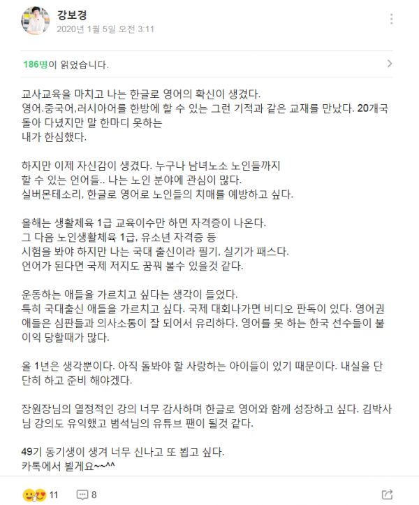 장원장님의 열정적인 강의 너무 감사하며 한글로 영어와 함께 성장하고 싶다.