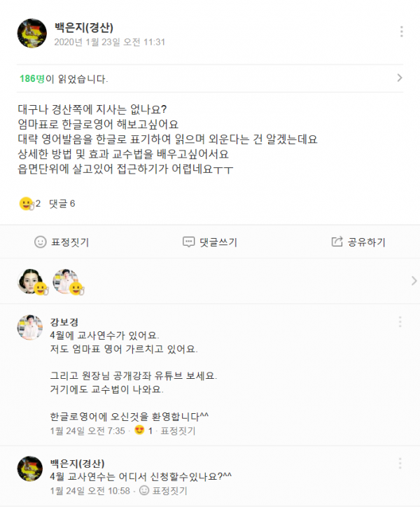 [출처] 네이버밴드 '한글로영어 위대한엄마' 20.1.23