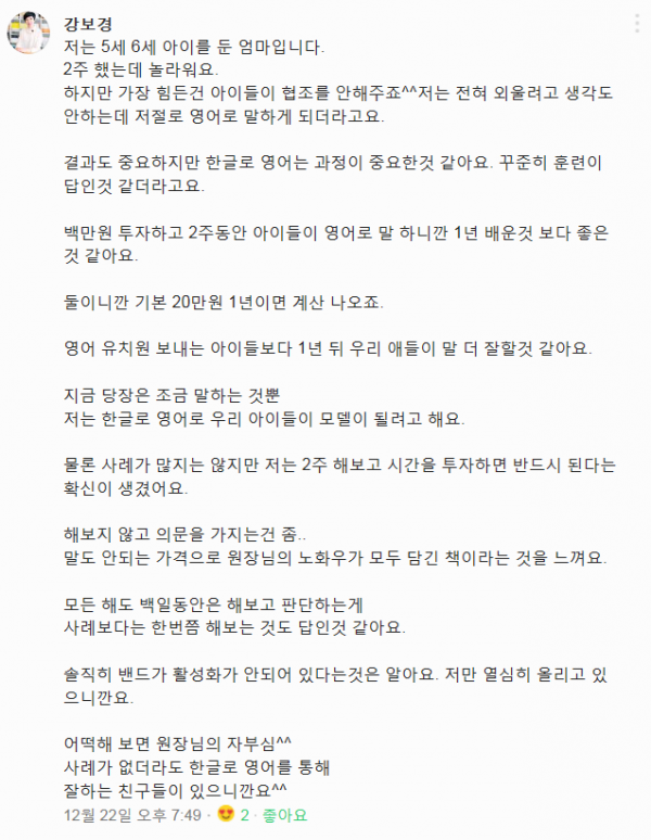 백만원 투자하고 2주동안 아이들이 영어로 말 하니깐 1년 배운것 보다 좋은것 같아요.