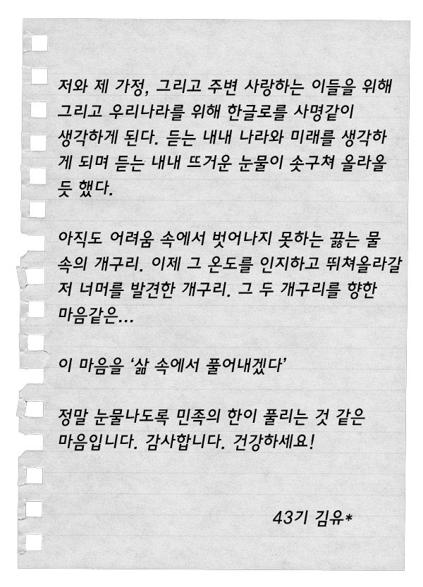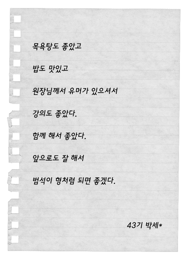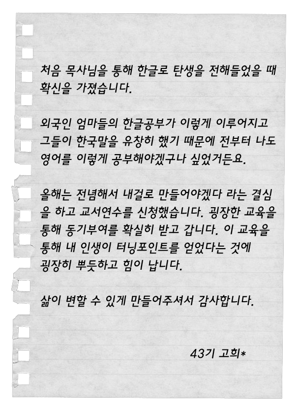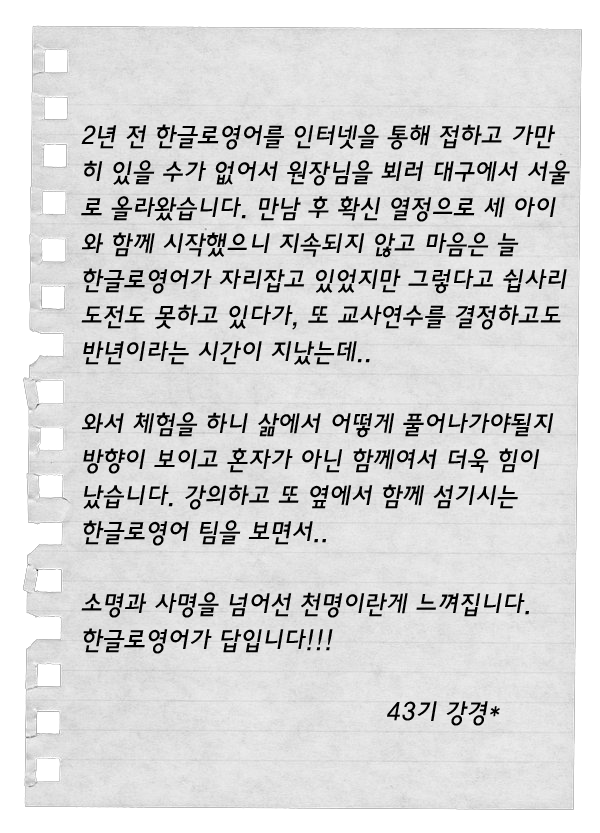 한글로 제43차 1월 11일~12일 교사연수 참석하신 분들 중 14개의 후기를 뽑아보았습니다!!