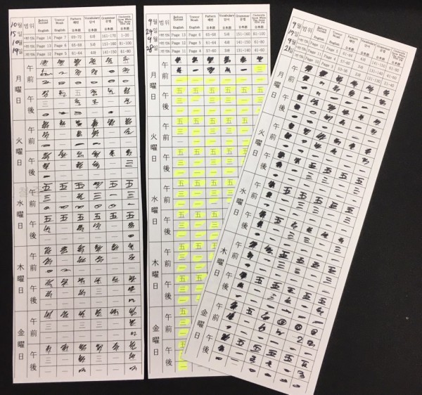이것저것 바인더에서 꺼내서 보여주었어요. 하루에 거의 한시간반 정도를 들여 오전, 오후 이렇게 두번 말하기 훈련을 하는데 체크하기 쉽게 직접 읽기표를 만들었데요. 영어 중국어는 계속 감을 유지하기 위해 매일 훈련하고 있데요. 언어는 안쓰면 또 감이 떨어지게 마련이거든요.