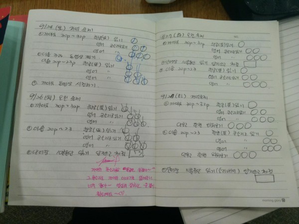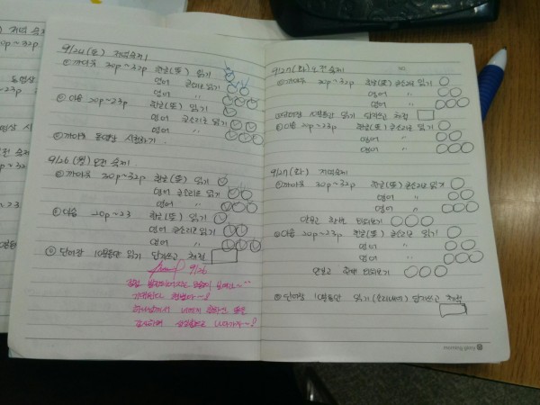 사실 말로 숙제 내주니 잘 안해와서 해봤는데 이방법 완전 좋으네요 개인적으로 이런 숙제노트도 만들어서 판매해도 될거 같다는 ㅋㅋ 요즘 아이들은 틀을 좀 정해줘야 따라오는 경우가 있어서~^^;;