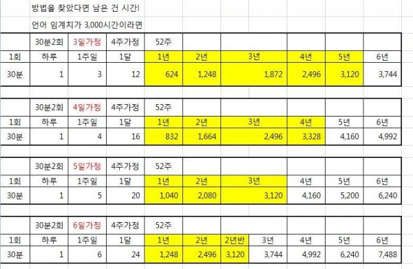 언어 임계치 찾아보니 정확하게 나와있지 않아서 제 나름 3천시간이라고 가정해 계산해봤어요.