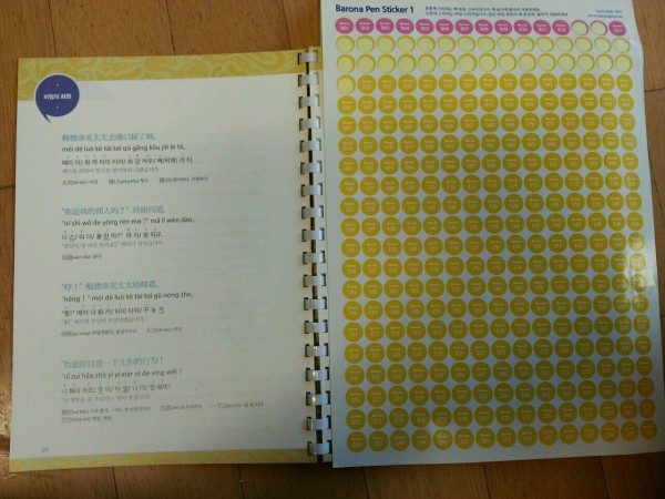 지금은 한글로 영어가 발전해서 교재도 많이 좋아졌습니다. 제가 아래에 사진 몇장을 첨부 할 건데 전 예전에 교재를 구입했기때문에 스티커 작업을 일일히 해야 합니다. 이 작업을 하고 있을때 저희 남편이 무슨 부업하냐고 물었습니다. ㅋㅋㅋ 졸면서 붙였던 적도 있고, 졸다가 잘못 붙여서 다시 살살 떼서 다시 붙였던 일도 있었기 때문이죠.... 행여나 떨어질까 스티커를 붙이고 그 위에 테이핑 작업까지 했다는^^;;; 그리고 남는 스티커는 아까워서 아직도 버리지도 못하고 갖고 있습니다.^^ (1년동안 묵혀두며 스티커를 어디에 뒀는지 몰라 다시 재구매 했었기 때문에...ㅜㅜ) 전 스티커 작업을 다 한줄 알았는데 아직도 높은 단계의 중국어는 안붙혔더라구요ㅠ.ㅠ 이번달 안에 다 붙이는게 제 목표입니다.^^;;;ㅎㅎㅎ